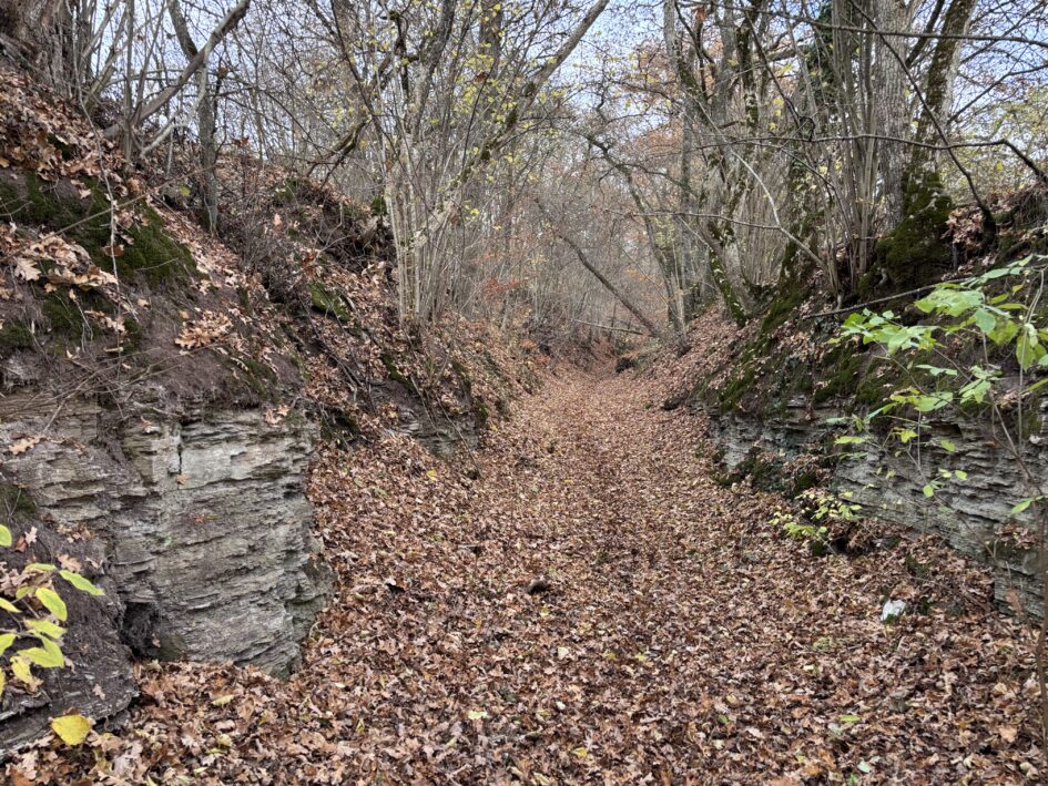 Wenig oberhalb der steinernen Ruhbank am Feldhäusle südöstlich von Breitenholz, am Südhang unterhalb Burg Müneck Richtung Entringen zu, beginnt im Hang eine etwa 3 bis 5 m breite Rinne schräg den Hang zum Schönbuch hinaufzusteigen. Im unteren Bereich ist sie in den Gipskeuper eingegraben, im oberen Bereich teils schluchtartig bis zu 10 m tief eingegraben. An den Böschungen sind hier noch Reste von alten Mäuerchen festzustellen. Im weiteren Verlauf endet die Rinne plötzlich und scheint mit Aushub, Bauschutt und auch Hausmüll verfüllt worden zu sein. Die ganze Strecke ist teils dicht bewachsen mit Gebüsch und Bäumen, still und verlassen. Lag hier einst eine Mülldeponie mit Zufahrtsweg?